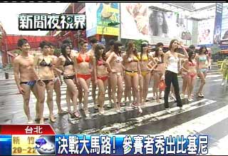 中新網(wǎng)4月29日電 據(jù)臺(tái)灣TVBS報(bào)道,臺(tái)北東區(qū)街頭28日下午出現(xiàn)清涼秀,電視比賽節(jié)目“決戰(zhàn)第一名”22名參賽者,把舞臺(tái)搬到大馬路上,直接把班馬線當(dāng)伸展臺(tái)走,參賽者身上只穿單薄比基尼走秀,路旁的行人則干脆拿手機(jī)拼命拍。