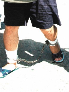 據(jù)稱,綠島監(jiān)獄規(guī)定所有新收受刑人從入獄當(dāng)天起得戴腳鐐?cè)齻(gè)月,表現(xiàn)好才解除,因腳鐐皆生銹,常有受刑人的腳磨破,細(xì)菌感染得到蜂窩性組織炎,腿腫得跟象腿一般,申請到臺(tái)灣就醫(yī),機(jī)票及醫(yī)藥費(fèi)還得自付。