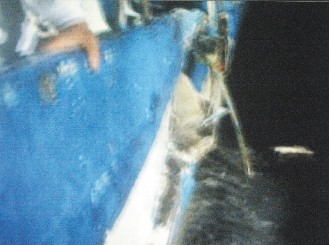 聯(lián)合號(hào)右前頭被撞破一個(gè)大洞,船身大量進(jìn)水,船長趕緊叫釣客們穿上救生衣準(zhǔn)備逃難。