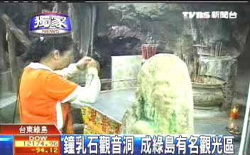 中新網(wǎng)6月18日電 據(jù)臺灣TVBS報道,綠島有個鐘乳石洞,里面有一座石筍,樣貌很像一座觀音,當?shù)孛癖姺Q為“觀音洞”,相傳多年前,有一名婦人來這里拜拜求子,果然成功,故事不斷流傳,后來越來越多人相信,有從臺中、高雄來,還有從基隆來,他們數(shù)十個人包船或搭機來,現(xiàn)在觀音洞,已經(jīng)成了綠島知名的觀光地區(qū)。