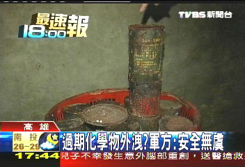 化學品上頭寫著DS2-消除劑,生產日期是1989年3月,有效期限只能到1992年3月,全是臺軍聯(lián)勤204廠所制造。制造方表示說:這些被棄過期化學品“對人體沒有影響,消除劑里頭有強堿,對環(huán)境會有疑慮,我們會專人回收處理!