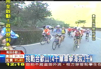 據(jù)臺(tái)灣TVBS報(bào)道,4000多輛自行車挑戰(zhàn)合歡山,出了市區(qū),上山路全是難關(guān)。合歡山公路超大斜坡,開(kāi)車的只要輕踩油門,但這些自行車騎士踩踏板的頻率已經(jīng)像在跑步,卻只能緩慢爬升。