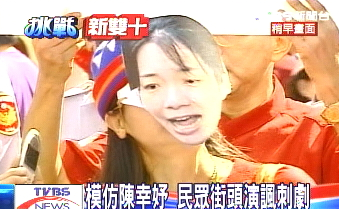 中新網(wǎng)10月10日電 曾經(jīng)在“雙十節(jié)”嗆扁的紅衫軍,今年一樣不缺席。前“立委”林正杰率領(lǐng)紅衫軍演出行動(dòng)劇,劇中模仿陳水扁女兒陳幸妤多次鏡頭前情緒崩潰的戲碼,諷刺臺(tái)灣當(dāng)局辦陳水扁家族洗錢案、機(jī)要費(fèi)案沒有魄力,但由于事前沒有申請,遭到警方舉牌警告。