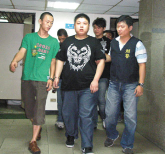 臺北市警方逮捕涉嫌擄人凌虐強(qiáng)索遮羞費的惡煞,其中嫌犯林楓杰(中)還逼被害人吞下兩顆子彈,手段兇殘。 (圖片來源:臺灣《聯(lián)合報》)
