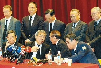 王文淵上午率領(lǐng)七人小組中的五位成員,臺(tái)塑石化董事長(zhǎng)王文潮、臺(tái)塑董事長(zhǎng)李志村、南亞董事長(zhǎng)吳欽仁、總管理處總經(jīng)理?xiàng)钫作爰爸饕聵I(yè)體總經(jīng)理一起主持記者會(huì),并向社會(huì)大眾對(duì)臺(tái)塑創(chuàng)辦人王永慶過世的哀悼致意并默哀。