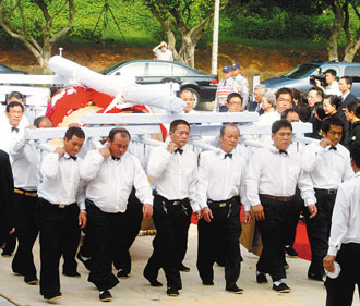 跪迎儀式簡(jiǎn)單隆重,隨后靈棺就由24位壯漢抬入靈堂。據(jù)了解,王永慶的“入殮”儀式,預(yù)定在下午5時(shí)舉行。
