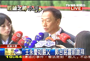據(jù)臺(tái)灣TVBS報(bào)道,郭臺(tái)銘說:“他是除我父親以外第一個(gè)跪拜的人,因?yàn)槲矣X得他的精神,他對(duì)我的照顧,他給我的啟發(fā),他不但是臺(tái)灣工業(yè)之父,在我心目中,就像一個(gè)嚴(yán)父、慈父一樣,所以我覺得我不能表達(dá)什么,但是我一點(diǎn)點(diǎn)小小的心意,能夠讓我對(duì)他有所的追思,有所的惋惜!