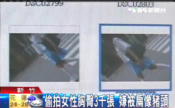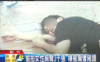 坐在警局里的林姓嫌犯,臉上包著一大塊紗布,警方說(shuō)他臉腫到像豬頭,因?yàn)樗嫦釉谛轮袷袌?chǎng)里,拿手機(jī)偷拍女性胸部和臀部,今天再度犯案的時(shí)候,當(dāng)場(chǎng)被市場(chǎng)攤販逮個(gè)正著,整個(gè)人被打到癱在地上,左眼縫了2針,臉腫得連家人都認(rèn)不出來(lái)。