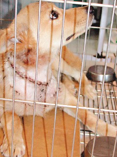 據(jù)臺灣TVBS報(bào)道,三只狗眼神無助,虛弱的躺在籠中,它們的脖子都有勒痕,深可見肉。其中一只狗被勒得頭部腫脹,另一只小時(shí)候就被人用塑料繩捆住脖子,長大居然變成奪命繩。最嚴(yán)重的一只狗,脖子被橡皮筋割喉,脖子潰爛小命都快不保。