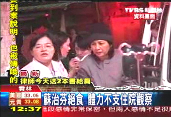 民進(jìn)黨籍云林縣長蘇治芬獄中絕食,已超過250個(gè)小時(shí)沒有吃東西,體力不支,兩度被送到醫(yī)院觀察。圖片來源:臺灣TVBS