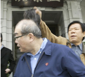 臺(tái)灣特偵組偵結(jié)扁家弊案,臺(tái)北地方法院承審法官周占春裁定陳水扁當(dāng)庭釋放,國(guó)民黨“立委”邱毅(左)前往臺(tái)當(dāng)局“監(jiān)察院”告發(fā)周占春,遭陳水扁支持者扯掉假發(fā)。圖片來源:臺(tái)灣《聯(lián)合報(bào)》