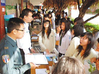 中新網(wǎng)12月17日電 據(jù)臺(tái)灣《聯(lián)合報(bào)》報(bào)道,臺(tái)北縣樹林市16日舉辦升學(xué)及就業(yè)博覽會(huì),有33所大專院校設(shè)攤招生,但受景氣不佳影響,僅有11家廠商前往征才,其中以臺(tái)軍人才招募中心被詢問度最高,攤位前擠滿許多想吃公家飯、不必?fù)?dān)心被資遣的學(xué)生。