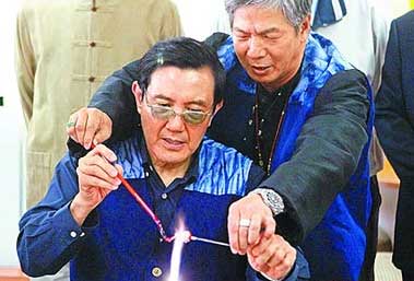 中新網(wǎng)2月9日電 據(jù)臺灣媒體報道,馬英九8日參訪臺灣工藝文化園區(qū),進行一趟臺灣工藝之旅。馬英九在琉璃老師建議及指導下,親自以琉璃燒制了“一顆心”,準備送給夫人周美青當情人節(jié)禮物。