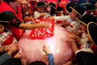 小朋友們邊搓湯圓,邊念吉祥話,要大家一起“搓圓圓、賺大錢”“團團圓圓大吉大利”。
