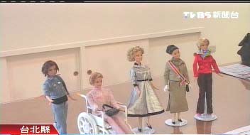 特色最不明顯的是曾文惠,志工翻閱照片,端詳許久,研究半天,最后以“高貴”為其主題,紅色套裝一上身,就有了架勢,但和其它夫人芭比相較,還是遜了一點(diǎn)。