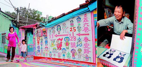 中新網(wǎng)4月7日電 據(jù)臺灣《聯(lián)合報》報道,臺中市有處五彩繽紛的彩繪眷村,墻面、地板畫滿人像、動物與色塊,夢境般場景吸引大批博客、攝影玩家,孤寂的眷村頓時熱鬧起來;這些圖畫都出自86歲退伍老兵黃永阜之手,他說,畫圖是排遣無聊,沒想到大家喜歡,讓他越畫越起勁。