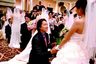 中新網(wǎng)4月16日電 據(jù)臺灣《聯(lián)合報》報道,花蓮縣15日在舉辦集體結(jié)婚,全縣100對新人完成終身大事,有日本郎娶臺灣美嬌娘,也有佛教醫(yī)院人員娶基督教醫(yī)院護(hù)士,新人在微微的細(xì)雨中走過許愿池,誓言情愛一生。