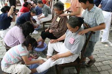 離島的金門也舉辦母親節(jié)表揚大會,表揚25位模范母親。承辦單位金門縣婦女權(quán)益促進會安排她們接受子女洗腳,讓老人家十分開心。