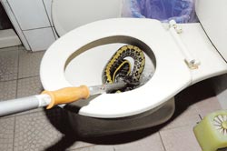 中新網5月11日電 一朝被蛇咬,十年怕馬桶?據臺灣《中國時報》報道,住南投埔里鎮(zhèn)山區(qū)的林姓男子,日前坐馬桶小解時,突感下體一陣劇痛,回頭赫見一條巨蛇躲在馬桶里昂首吐舌信,咬破他的陰囊鮮血直流,趕緊負傷求助鄰人送醫(yī);醫(yī)生說所幸黑眉錦蛇無毒,否則連小命也不保。