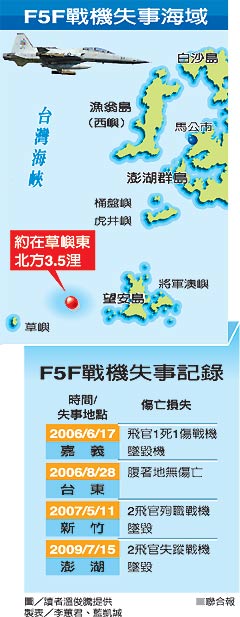 2009年7月15日編號5410的F-5F戰(zhàn)機,在澎湖石礁靶場執(zhí)行空對地炸射訓(xùn)練失事,飛官黃挺瑜中尉和張良元中校失蹤。