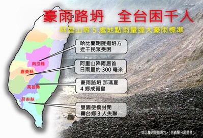 南投縣信義鄉(xiāng)神木村23日雨量累積超過(guò)170毫米,造成愛(ài)玉子溪便道遭泥石流阻斷,參加喜宴的400多名賓客受困,幸好村長(zhǎng)鐘桂南搶通另一條大石爺便道,所有賓客全部脫困。