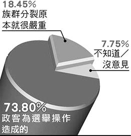 記者:根據(jù)臺灣的民調(diào),在現(xiàn)在臺灣的政治現(xiàn)實里面,隨著藍(lán)綠的斗爭,族群議題好像炒作得越來越嚴(yán)重?