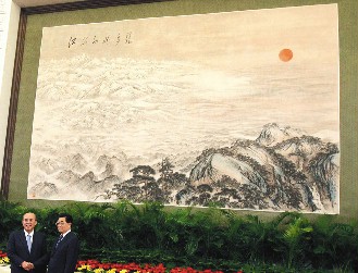 中共中央總書(shū)記胡錦濤與中國(guó)國(guó)民黨主席吳伯雄在巨幅山水畫(huà)下握手合影。(圖:臺(tái)灣《聯(lián)合報(bào)》)