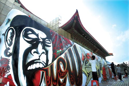 中新網(wǎng)10月22日電 據(jù)臺灣《中國時報》報道,昨日天氣晴朗,民眾紛紛外出走動,臺北“中正紀(jì)念堂”內(nèi)雖然有兩廳院屋宇修復(fù)工程,卻也舉行快樂涂鴉活動,邀請涂鴉高手在圍籬上一展身手,為修繕中的兩廳院增添了不同的面貌。