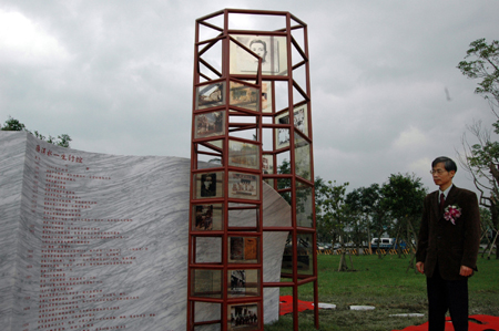 臺灣省宜蘭縣史館二十九日在縣議會為反日殖民統(tǒng)治先驅(qū)蔣渭水舉行紀念物揭幕典禮,蔣渭水孫子蔣朝根(右)親自參加!爸醒肷纭眻D 沈如峰 攝
