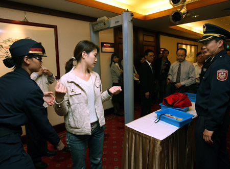 臺(tái)灣當(dāng)局“國(guó)安”單位近來(lái)加強(qiáng)安全工作。圖為陳水扁十三日出席公開(kāi)活動(dòng)時(shí),出席人員連外套都須脫下檢查!爸醒肷纭眻D 郭日曉 攝