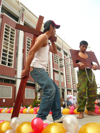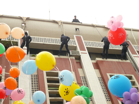臺(tái)灣屏東地檢署十八日舉辦反賄選的造勢(shì)宣傳,以背十字架和套枷鎖提醒候選人賄選“遺臭萬年,活罪難逃”。還有霹靂小組在“鐘馗的法眼”氣球群中垂吊而下,象征檢警調(diào)布滿天羅地網(wǎng),法眼難逃!爸醒肷纭眻D 郭芷瑄 攝