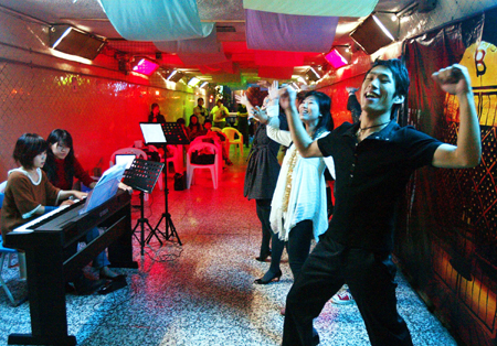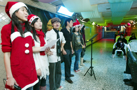 臺灣師范大學前師大路、和平東路口的“師大和平地下道”再度變身,二十日晚間舉行“圣誕老人從地底竄出——圣誕百老匯音樂狂歡夜”,學生演出圣誕音樂劇及歌曲,過往民眾享受節(jié)日氣氛。“中央社”圖 孫仲達 攝