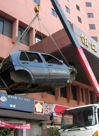 臺灣戲劇表演家“我是你爸爸”舞臺劇二十日在高雄市開演,劇團克服演出場地限制,將一輛報廢汽車吊掛至舞臺,在舞臺上呈現噱頭。“中央社”圖 程啟峰 攝