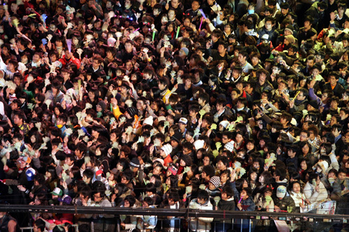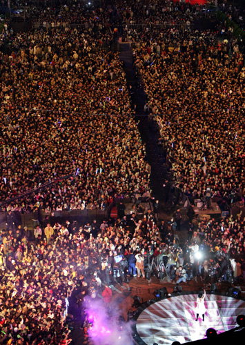 臺北市政府前廣場十二月三十一日舉辦“2008臺北最HIGH新年城”跨年晚會,炫麗的舞臺燈光和精彩的藝人表演,吸引上萬的民眾一起前來參加跨年晚會。(“中央社”圖;張皓安攝)
