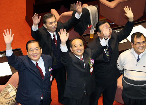 臺灣地區(qū)第七屆“立法院”二月一日選舉“立法院長”,中國國民黨籍“立委”王金平(前左二),以85票對27票打敗對手,確定連任“立法院長”,中國國民黨籍“立委”曾永權(前左一)則高票當選“副院長”。(“中央社”圖;郭日曉攝)