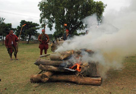 臺東少數(shù)民族的三十多個部落將于“二二八”紀念日當天集體燃放狼煙,二十七日各族群代表在卑南人卡地布部落點燃火苗。臺灣少數(shù)民族部落放狼煙有兩種情況,一種是狩獵時,獵人們單純聯(lián)絡;另一種是部落狼煙,各族群要表達意思大同小異,主要是與天神溝通的語言,有請示、告知、響應的意義!爸醒肷纭眻D 盧太城 攝