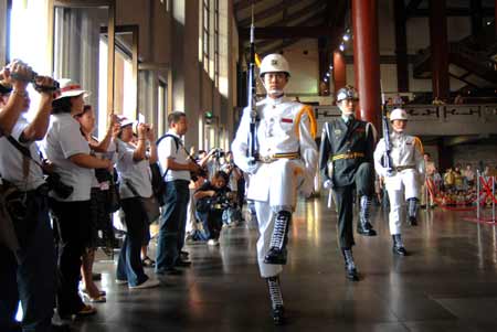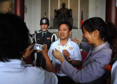 兩岸周末包機四日啟動,廣州首發(fā)旅游團抵臺后即前往臺北“國父紀念館”參觀,正好看到三軍儀隊表演,感到很興奮,手中相機拍不停。