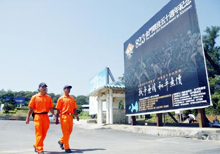 金門八二三炮戰(zhàn)五十周年即將到來,臺(tái)灣軍方和金門縣政府合辦系列紀(jì)念活動(dòng),并在“小三通”水頭港區(qū)布置巨幅看板,提醒“戰(zhàn)爭(zhēng)無情、和平無價(jià)”。圖:“中央社”