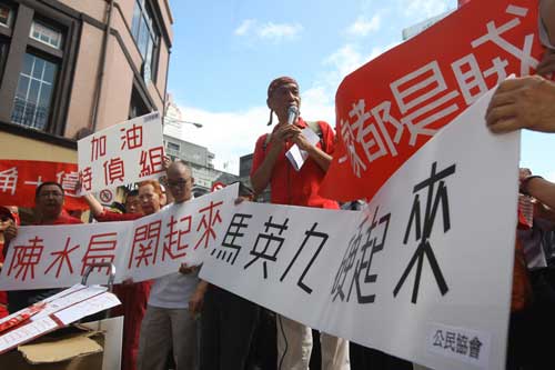 前紅衫軍干部林正杰(右)十日帶領(lǐng)一群紅衫軍成員在臺“雙十”大會現(xiàn)場外圍,高舉標(biāo)語海報(bào),要馬英九硬起來,同時(shí)呼吁特偵組盡快將陳水扁抓起來。(“中央社”圖)