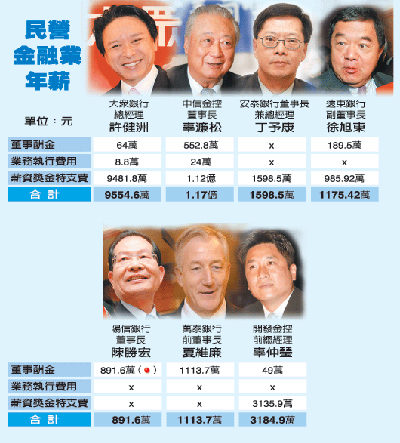 依已公告薪酬的金融機(jī)構(gòu)年報(bào),中信金董事長(zhǎng)辜濂松全年合計(jì)領(lǐng)取1.17億元最多,許健洲全年薪酬9,554萬(wàn)元名列第二。第三名是安泰銀董事長(zhǎng)丁予康的1,598萬(wàn)元,但丁予康同時(shí)兼任安泰銀總經(jīng)理,一人身差二職才領(lǐng)取逾千萬(wàn)元年薪。