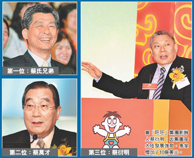 今年上榜富豪中僅5人錄得資產(chǎn)增長,當(dāng)中3人得益于大陸業(yè)務(wù)發(fā)展。“大贏家”是旺旺集團創(chuàng)辦人蔡衍明,集團在大陸發(fā)展強勁,身家急漲10億美元,排名從第9名跳升至第3名。另一食品集團康師傅的創(chuàng)辦人魏應(yīng)州,身家也大增5.5億美元,升至第5名。