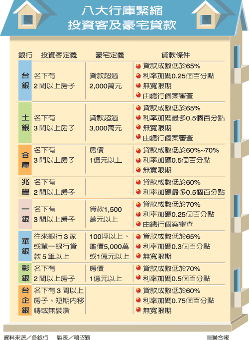 合作金庫董事長劉燈城說,上周已發(fā)文給營業(yè)單位,定義豪宅為超過一億元(新臺幣,下同)的房子,貸款成數(shù)都降為六成,和一般房貸的八成相比降了兩成,貸款利率也加碼0.5%,同時取消寬限期。至于投資客申請房貸,只要不是換屋,第二棟的貸款成數(shù)降為七成,并取消寬限期,第三棟的利率加碼0.5百分點。