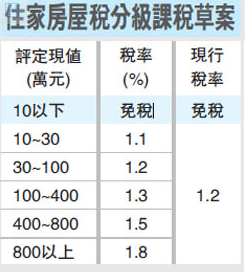 根據(jù)“財(cái)政部”所擬草案,房屋評(píng)定現(xiàn)值在10萬(wàn)元以下者,仍維持免稅;超過(guò)10萬(wàn)元以上的住家用房屋,房屋稅將分為五級(jí)課稅,稅率分別是1.1%、1.2%、1.3%、1.5%及1.8%。