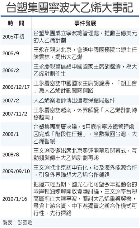 “大乙烯計劃”原是臺塑寧波石化的二期專案,包括年產(chǎn)1,000萬噸的煉油、年產(chǎn)120萬噸的乙烯裂解廠,60萬噸的丙烯廠、16.7萬噸的丁二烯廠,以及芳香烴系列,投資總額是100億美元,是臺塑集團創(chuàng)辦人王永慶先前積極推動的登陸投資案。
