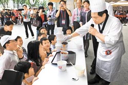 臺(tái)北館1日也舉行牛肉面試吃活動(dòng),許多游客攜家?guī)Ь欤屝∨笥褍?yōu)先排隊(duì)嘗美食。