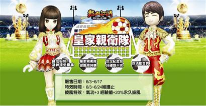 臺灣網(wǎng)游廠商也夠聰明,他們推出了應景的世界杯風格裝備產品。目前臺灣最熱血的武俠網(wǎng)游非華義旗下的“熱血江湖”莫屬。6月正值該游戲的改版升級階段,游戲服務商就順勢將6月打造成了“世足月”。其中最令球迷玩家興奮的就是,游戲地圖中將新增綠茵場為全新場景,游戲裝備也同步推出新款披風“皇家親衛(wèi)隊”。這款披風除了可以幫助玩家增加經驗值、氣功攻擊力之外,還能讓玩家為自己喜愛的球隊加油打氣,在游戲中體驗拉拉隊的歡樂氛圍。(導報記者 燕子 綜述)