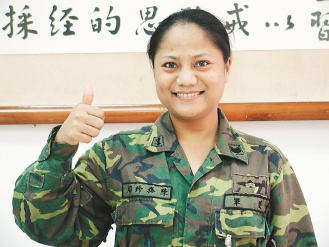 38歲陳梅珍從小想當(dāng)護(hù)士,中學(xué)畢業(yè)考上護(hù)專,但學(xué)費(fèi)貴,家里無力負(fù)擔(dān)。念完高中后,為減輕父母負(fù)擔(dān),入伍成為臺軍首批志愿役女士官,F(xiàn)在是陸軍空降訓(xùn)練中心士官長,去年協(xié)助訓(xùn)練連上人員,獲得“莒光連隊”殊榮。