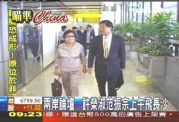 范振宗和許榮淑今天上午從桃園機場出發(fā),搭乘華航班機到長沙,而國民黨代表團11點鐘則從松山機場搭包機直飛長沙,各自出發(fā)。