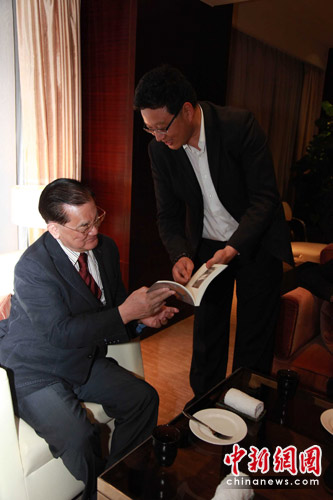 中新網(wǎng)杭州5月2日電 (記者嚴格)正在杭州參訪的中國國民黨榮譽主席連戰(zhàn)5月2日晚在其下榻的賓館會見了中新社浙江分社社長王旻及多次采訪連戰(zhàn)的分社記者,并接受了由中新社浙江分社與浙江省臺辦共同編撰的《浙臺口述歷史》一書。