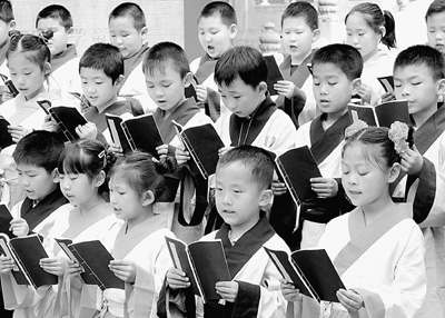 60位身著古代學(xué)生服的學(xué)童,齊聲誦讀《弟子規(guī)》;大陸絲竹名家塤琴合奏《幽蘭操》。朗朗童聲,悠悠古樂(lè),回蕩在古樹(shù)參天、屋宇儼然的孔廟。